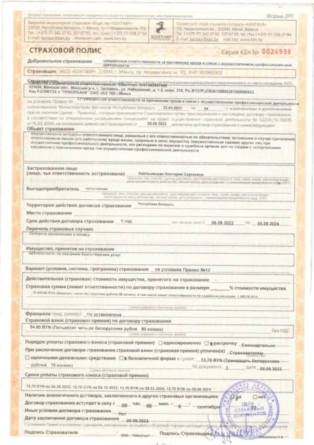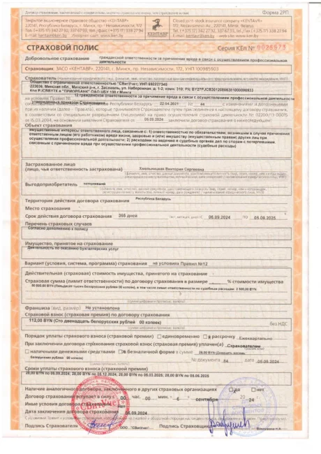 Как говорил Остап Бендер: «Полное спокойствие может дать человеку только страховой полис.» Так вот, профессиональная деятельность ООО «СВитУчет» застрахована и Вы можете быть полностью спокойны!